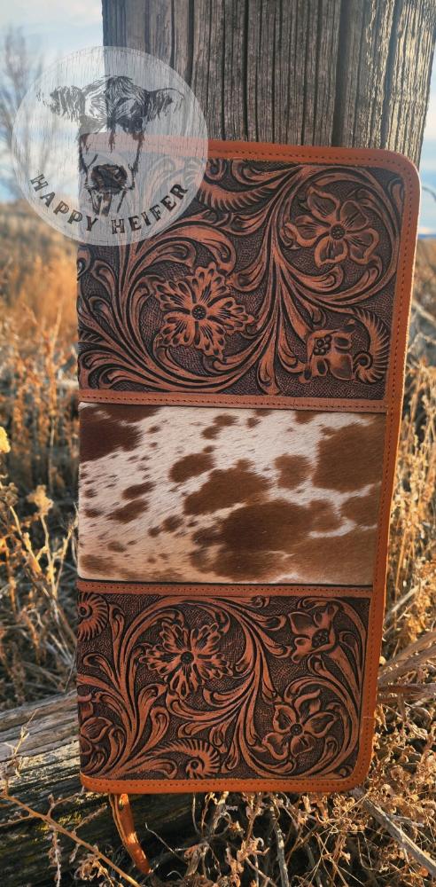 Handcrafted Tooled leather and Cowhide Bangle Wristlet